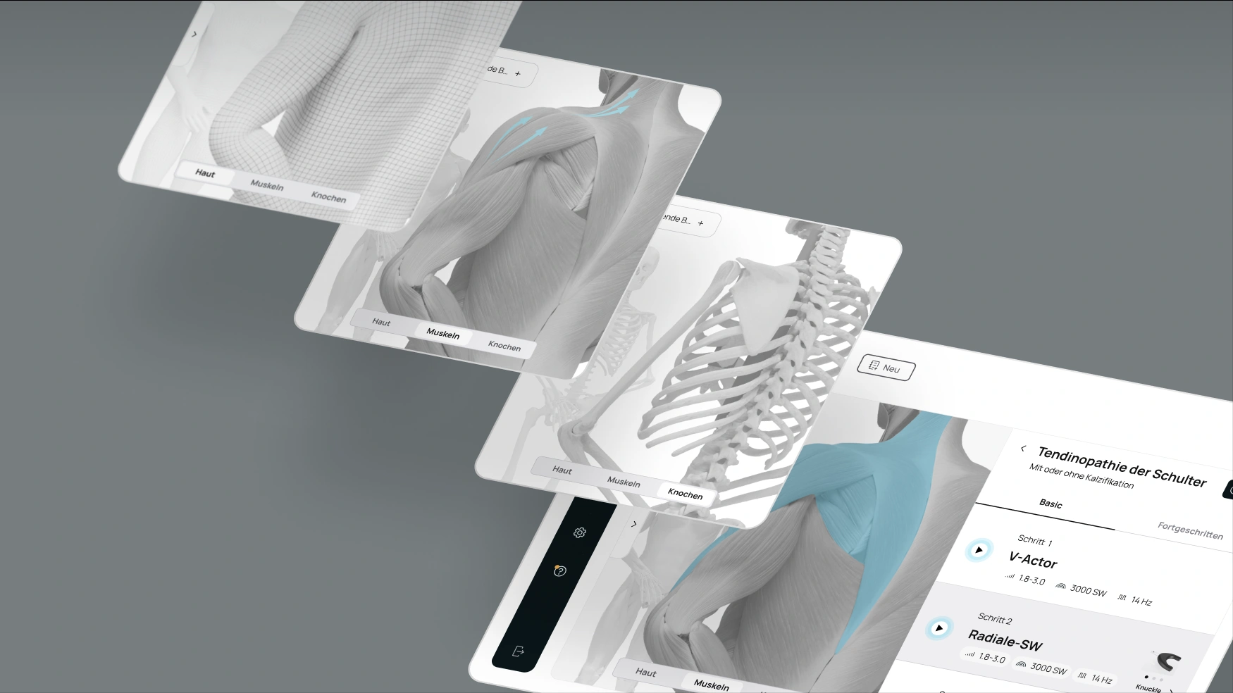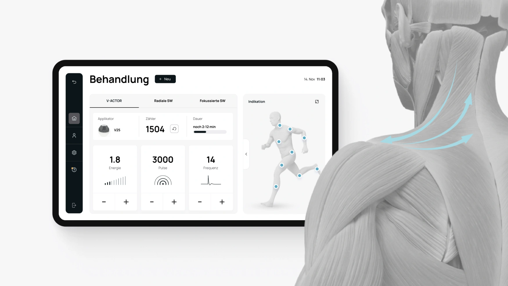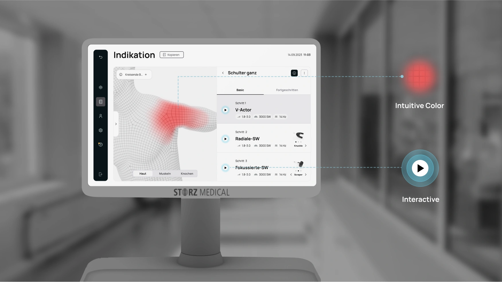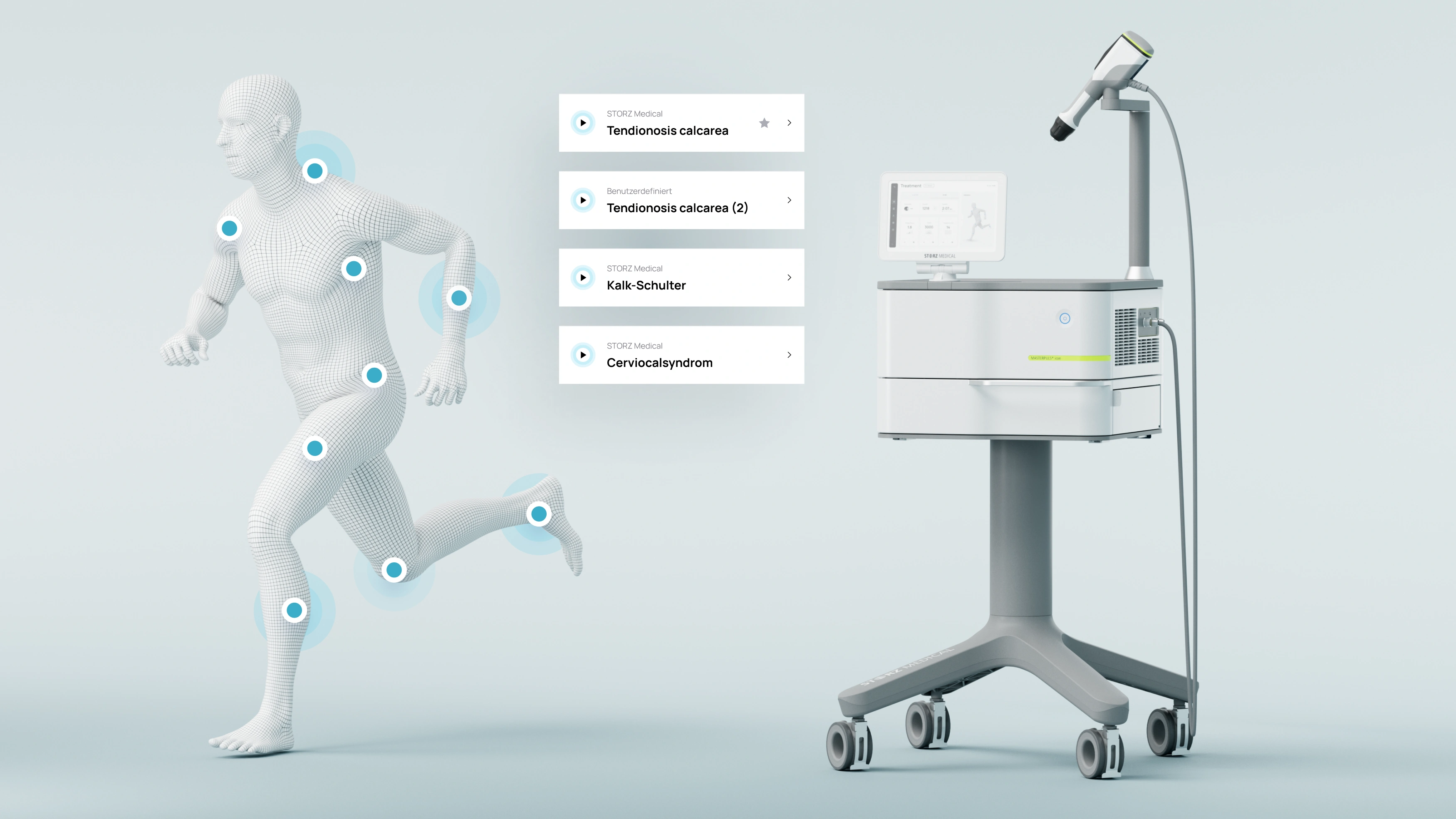 We went into the field with application specialists and healthcare professionals (HPs) to learn and map the ideal therapy flow, then rebuilt the application around it: a workflow-based architecture, clear hierarchy for critical parameters, and an integrated visual language. To further support patient communication, we introduced a precise, friendly avatar that explains indications and planned steps. Prototypes were iterated and tested, then refined with Storz Medical’s product and development teams for implementation.